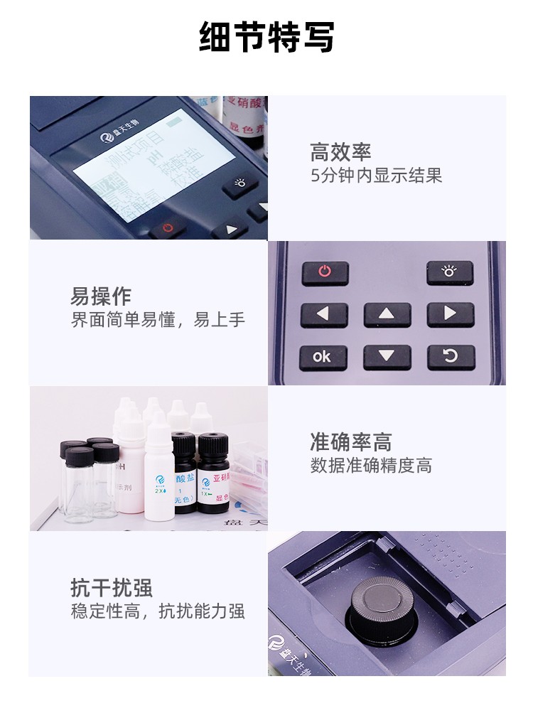 一款適用于工業污水、水產養殖等領域的檢測儀,配合檢測試劑,可“快速、簡單、準確、穩定”進行測量,擁有精美的外觀造型,簡單的操作界面,準確的檢測系統,幫助用戶獲得精細的數據,可更準確、有效的分析水體狀況,提前預防養殖風險,及時避免損失。 數據準確,攜帶方便,檢測快速,操作簡單